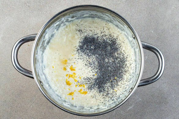 Den Milchreis mit dem Vanillezucker und dem Mohn verfeinern und nach Geschmack 1–2TL Zitronenschale untermischen. Kurz abkühlen lassen, dann den Milchreis mit dem Kompott anrichten und mit den Pinienkernen garniert servieren.