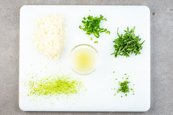 Den Backofen auf 220°C (200°C Umluft) vorheizen. Den Käse fein reiben. Die Limettenschale abreiben, dann die Limette halbieren und auspressen. Die Korianderblätter abzupfen und grob schneiden, die Stängel fein hacken. Die Chilischote längs halbieren und in feine Streifen schneiden. Tipp: Für weniger Schärfe die Kerne entfernen.