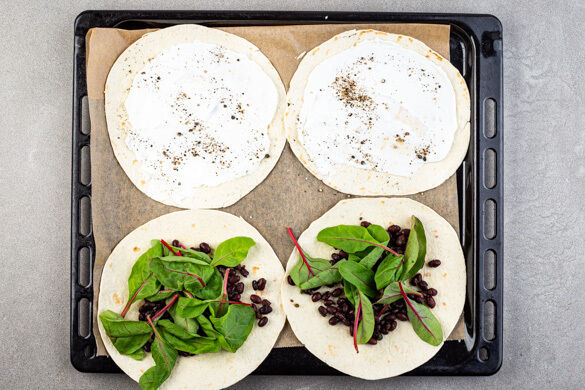 2 Tortillas mit dem Ziegenfrischkäse bestreichen, mit je 1 Prise Salz und Pfeffer würzen. 2 weitere Tortillas auf ein mit Backpapier ausgelegtes Backblech legen und die Bohnen ohne Flüssigkeit und den Babymangold darauf verteilen. Die Bohnen-Mangold-Tortillas mit den Frischkäse-Tortillas abdecken, sodass die unbestrichene Seite oben ist.