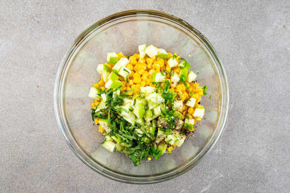 Die 1/2 des Maises oder mehr nach Geschmack in ein Sieb abgießen und abtropfen lassen. Den Apfel vierteln, entkernen und in kleine Würfel schneiden. Den Mais und den Apfel mit den Korianderblättern, der Limettenschale, dem restlichen Limettensaft, 2EL Olivenöl und der Chilischote nach Geschmack vermengen. Mit Salz und Pfeffer und ggf. etwas Essig abschmecken.