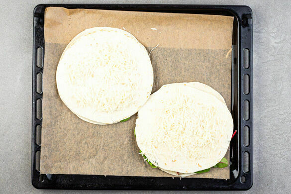 Die Quesadillas mit dem geriebenen Käse bestreuen und im Ofen 6–8Min. backen, bis der Teig leicht knusprig und der Käse geschmolzen ist.