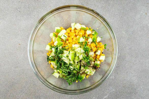 Den Mais in ein Sieb abgießen und abtropfen lassen. Die Äpfel vierteln, entkernen und in kleine Würfel schneiden. Den Mais und die Äpfel mit den Korianderblättern, der Limettenschale, dem restlichen Limettensaft, 3EL Olivenöl und der Chilischote nach Geschmack vermengen. Mit Salz und Pfeffer und ggf. etwas Essig abschmecken.