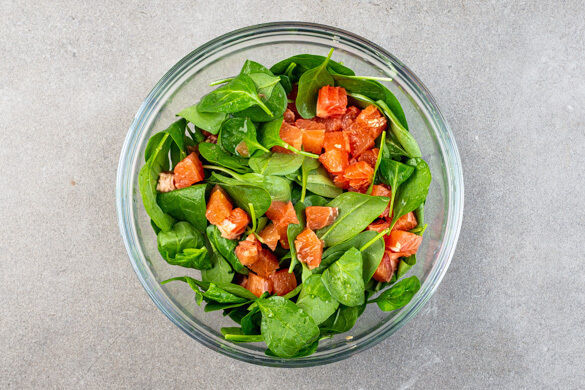 Den Spinat mit 1EL Essig, 1TL Olivenöl und je 1 kräftigen Prise Salz und Pfeffer vermengen, dann die Grapefruit unterheben und mit dem Saft abschmecken. Das Röstgemüse mit dem Salat anrichten und die Fetacreme dazu servieren.