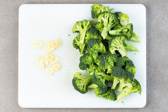 In einem großen Topf ausreichend gesalzenes Wasser für die Nudeln und den Brokkoli zum Kochen bringen. Den Knoblauch schälen und in dünne Scheibchen schneiden. Den Brokkoli in mundgerechte Röschen schneiden, den Strunk ggf. schälen und in 0,5–1cm dünne Scheiben schneiden.