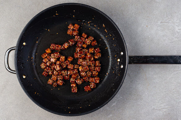 Die Teriyakisauce hinzufügen, sobald der Tempeh goldbraun und knusprig ist. Noch mal ca. 1Min. braten, die Sauce einköcheln lassen und dabei die Pfanne hin und her bewegen, sodass der Tempeh gleichmäßig von Sauce bedeckt wird. Vom Herd nehmen, mit dem Sesam vermengen und auf einem Teller warm halten. Die Pfanne nicht auswischen.