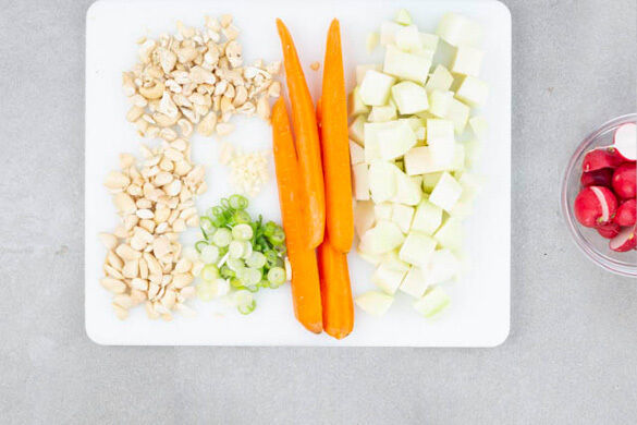 Den Backofen mit Grillfunktion oder Ober-/Unterhitze auf 250°C vorheizen. Den Kohlrabi schälen und in 1–2cm große Würfel schneiden. Die Karotte ggf. schälen, längs vierteln und ggf. noch mal quer halbieren. Die Radieschen halbieren. Die Lauchzwiebel in feine Ringe schneiden. Den Knoblauch schälen und fein würfeln. Die Cashews und die Mandeln grob hacken.