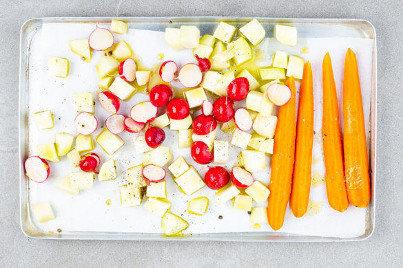 Währenddessen den Kohlrabi, die Karotten und die Radieschen auf einem mit Backpapier ausgelegten Backblech mit 1–2EL Olivenöl sowie je 2–3 Prisen Salz, Pfeffer und Zucker vermengen, gleichmäßig verteilen und 8–10Min. im Ofen grillen.