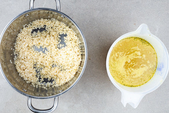 Das restliche Brühgewürz in 1,5L heißem Wasser auflösen. Den Reis in einem mittelgroßen Topf mit 2–3EL Olivenöl bei mittlerer Hitze 2–4Min. glasig anschwitzen. Den Knoblauch zugeben und ca. 1Min. mitbraten, dann mit 1–2TL Essig ablöschen und köcheln lassen, bis der starke Essiggeruch verflogen ist. Nach und nach mit der Brühe einköcheln lassen, bis der Reis bissfest ist.