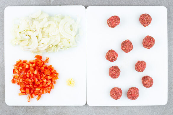 Den Backofen auf 220°C (200°C Umluft) vorheizen. Die Zwiebeln schälen, halbieren und in feine Streifen schneiden. Den Knoblauch schälen und fein würfeln. Die Tomaten ebenfalls fein würfeln. Den Dill samt Stängeln fein schneiden, harte Stängel entfernen. Das Hackfleisch, die Gewürzmischung und 1 kräftige Prise Salz verkneten und ca. 10 walnussgroße Bällchen formen.