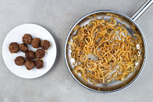Die Hackbällchen in einer mittelgroßen Pfanne mit 1EL Olivenöl bei mittlerer Hitze 3–4Min. rundum anbraten, dann auf einem Teller beiseitestellen. Die Hackbällchen müssen noch nicht gar sein. Die Zwiebeln in derselben Pfanne mit 1EL Olivenöl bei mittlerer Hitze 5–6Min. goldbraun anbraten.