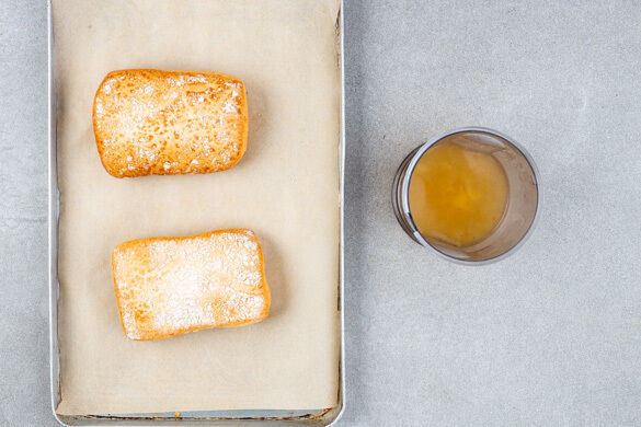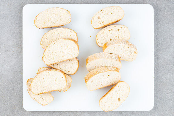 Inzwischen das Brühgewürz in 250ml heißem Wasser auflösen. Das Brötchen auf einem mit Backpapier ausgelegten Backblech 4–6Min. im Ofen aufbacken.