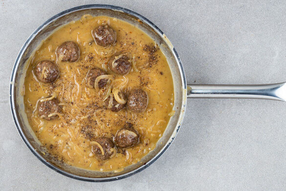 Die Zwiebeln mit 1–2TL Mehl bestäuben und unter Rühren noch ca. 1Min. braten. Mit der Brühe ablöschen, umrühren und bei mittlerer Hitze ca. 5Min. köcheln lassen. Die Hackbällchen dazugeben und abgedeckt ca. 10Min. köcheln lassen, bis die Hackbällchen gar sind. Mit 1–2EL Essig sowie Salz und Pfeffer abschmecken.