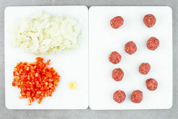 Den Backofen auf 220°C (200°C Umluft) vorheizen. Die Zwiebeln schälen, halbieren und in feine Streifen schneiden. Den Knoblauch schälen und fein würfeln. Die Tomaten ebenfalls fein würfeln. Den Dill samt Stängeln fein schneiden, harte Stängel entfernen. Das Hackfleisch, die Gewürzmischung und 2 Prisen Salz verkneten und ca. 16 walnussgroße Bällchen formen.