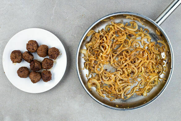 Die Hackbällchen in einer großen Pfanne mit 1EL Olivenöl bei mittlerer Hitze 3–4Min. rundum anbraten, dann auf einem Teller beiseitestellen. Die Hackbällchen müssen noch nicht gar sein. Die Zwiebeln in derselben Pfanne mit 1EL Olivenöl bei mittlerer Hitze 5–6Min. goldbraun anbraten.
