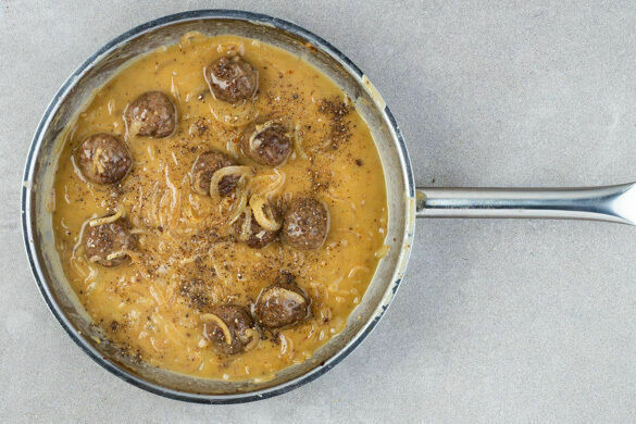 Die Zwiebeln mit 1EL Mehl bestäuben und unter Rühren noch ca. 1Min. braten. Mit der Brühe ablöschen, umrühren und bei mittlerer Hitze ca. 5Min. köcheln lassen. Die Hackbällchen dazugeben und abgedeckt ca. 10Min. köcheln lassen, bis die Hackbällchen gar sind. Mit 1–2EL Essig sowie Salz und Pfeffer abschmecken.