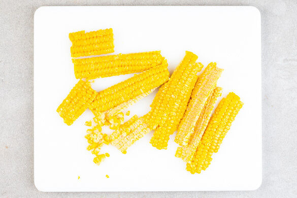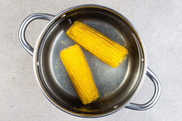 In einem mittelgroßen Topf ausreichend gesalzenes Wasser für den Mais und die Süßkartoffel zum Kochen bringen. Den Maiskolben schälen, dabei ggf. vorhandene Härchen entfernen, und in das warme Wasser geben (auch wenn es noch nicht kocht). Den Mais in 18–20Min. gar kochen.