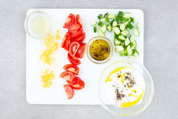 Die Gurke längs vierteln und in 1cm große Stücke schneiden. Die Tomaten halbieren und jede Hälfte in 4 Spalten schneiden, dabei den Strunk entfernen. Die Zitrone abreiben und auspressen. 4–5EL Olivenöl mit 3–4EL Zitronensaft, etwas Zitronenabrieb sowie Salz und Pfeffer verrühren. Den Joghurt mit Salz, Pfeffer, 1–2EL Olivenöl und ggf. etwas Zitronenabrieb verrühren.