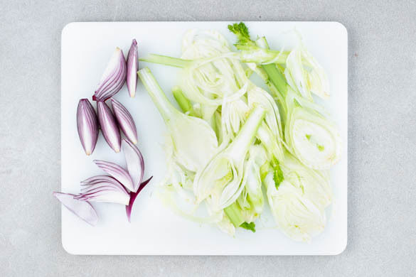 Den Backofen auf 220°C (200°C Umluft) vorheizen. Den Fenchel der Länge nach in dünne Streifen schneiden, dabei den Strunk entfernen. Die Zwiebel schälen, halbieren und jede Hälfte in 4 Spalten schneiden.