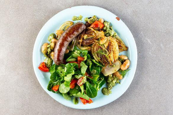 Die Vorzüge einer leckeren Rindswurst sind offensichtlich – aber wusstest du, wie gesund Borlottibohnen sind? In Italien werden die Toskaner sogar liebevoll „Bohnenesser“ genannt, so oft steht das leckere Böhnchen dort auf dem Tisch. Richtig so! Denn Bohnen sind voller Eiweiß und wunderbar vielseitig. Hier glänzen sie als schnelle Mahlzeit nebst Feldsalat, Tomaten und Fenchel. Dazu noch ein frisches Pesto – perfetto!