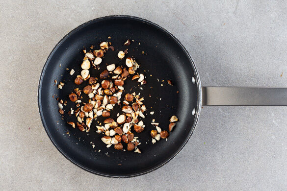 Die Haselnüsse grob hacken und in einer mittelgroßen Pfanne ohne Zugabe von Fett bei mittlerer Hitze 2–3min. goldbraun anrösten. Vorsicht, die Nüsse können schnell zu dunkel werden. Auf einem Teller beiseitestellen. Die Fenchelstiele entfernen und den Fenchel der Länge nach in dünne Scheiben schneiden. Den Knoblauch schälen.