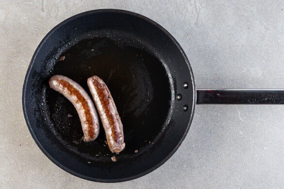 Die Würste in der Pfanne mit 1EL Olivenöl bei mittlerer Hitze 2–3Min. rundum goldbraun anbraten. Dann die Hitze reduzieren und noch ca. 10Min. weiterbraten, bis die Würste heiß sind.