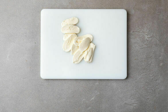 Den Mozzarella in dünne Scheiben schneiden.