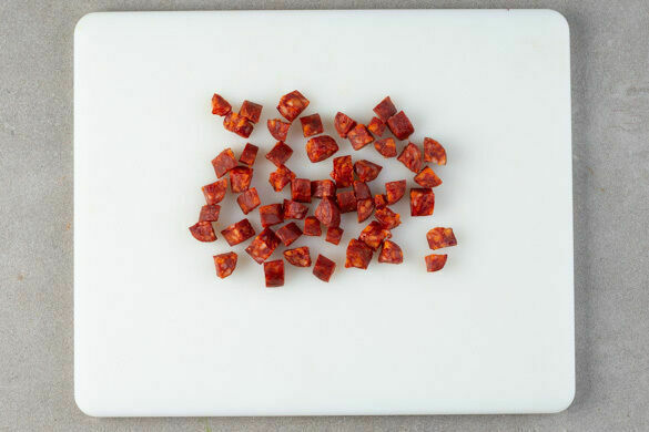 Die Chorizo mit einem scharfen Messer von der Pelle befreien und in kleine Würfel schneiden.