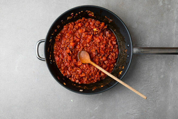 Die Chorizo in einer großen Pfanne ohne Zugabe von Fett bei mittlerer Hitze 1–2Min. anbraten. Die Paprika, die Zwiebeln und den Knoblauch dazugeben und 2–3Min. mitbraten, dann mit dem Gulaschgewürz bestäuben und mit den gehackten Tomaten ablöschen. Die Sauce 5–6Min. sanft köcheln lassen und mit Salz und Pfeffer abschmecken.