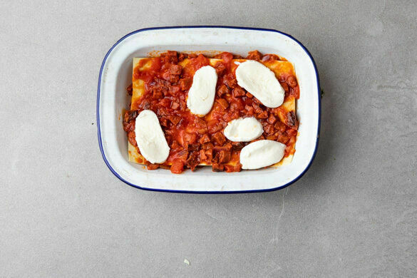 In einer Auflaufform 1–2EL Sauce verstreichen, dann abwechselnd Lasagneblätter, Sauce, Basilikum und Mozzarella einschichten, bis alles aufgebraucht ist. Mit Sauce und Käse abschließen. Tipp: Wer mag, kann einige Basilikumblätter für die Garnitur beiseitelegen.