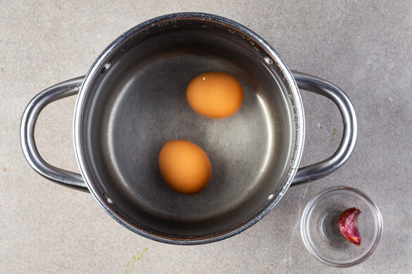 Die Eier in das kochende Wasser geben und bei niedriger Hitze 5–6Min. köcheln lassen, um weich gekochte Eier zu erhalten. Das Wasser für wachsweiche Eier 7–8Min. köcheln lassen. Die Eier abgießen und kalt abschrecken. Den Topf mit kaltem Wasser füllen und die Eier darin abkühlen lassen. Die Knoblauchzehe aus dem Ofen holen.