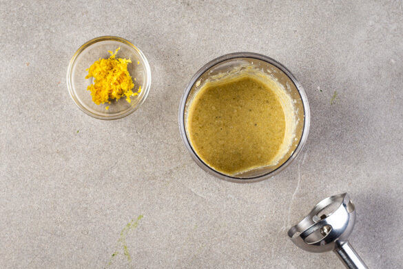 Den Käse fein reiben. Die Zitronenschale abreiben, dann die Zitrone auspressen. Den Zitronensaft, die geschälte Knoblauchzehe, den Käse, die übrigen Kichererbsen und die Kapern in einem hohen Gefäß mit einem Stabmixer pürieren. Schrittweise etwas Kichererbsenwasser hinzufügen und bis zur gewünschten Cremigkeit pürieren. Mit Salz und Pfeffer abschmecken.