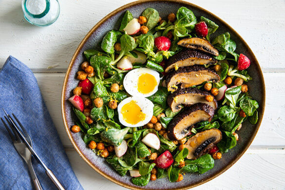 Der Portobello ist wahrlich der König der Pilze! Prallvoll mit Mineralstoffen und Vitaminen schmeckt er nicht nur ganz fantastisch, er ist auch noch supergesund! Auch heute zeigt er sich ganz royal, wenn er auf raffinierte Weise den leckeren Feldsalat mit Radieschen, knusprig gegrillten Kichererbsen und wachsweichem Ei krönt. Ein zitroniges Dressing mit Käse, Kapern und Knoblauch vereint das edle Gericht. Wir verneigen uns.