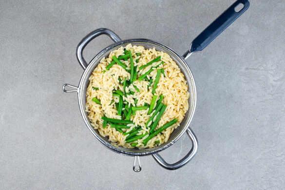Die Pasta und die Bohnen ins kochende Wasser geben und bei mittlerer Hitze in 7–10Min. bissfest kochen. In ein Sieb abgießen, abtropfen und leicht abkühlen lassen.