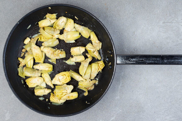 Den Knoblauch und die Artischocken in der Pfanne bei mittlerer Hitze ca. 2Min. braten.