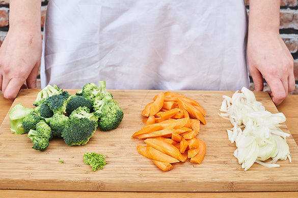Den Backofen auf 220°C (200°C Umluft) vorheizen. Den Brokkoli in ca. 2cm große Röschen schneiden. Die Karotte ggf. schälen, längs halbieren und schräg in ca. 1cm breite Scheiben schneiden. Die Zwiebel schälen, halbieren und in dünne Streifen schneiden. Die Limettenschale abreiben, dann die Limette halbieren und auspressen. Den Ingwer schälen und fein reiben.