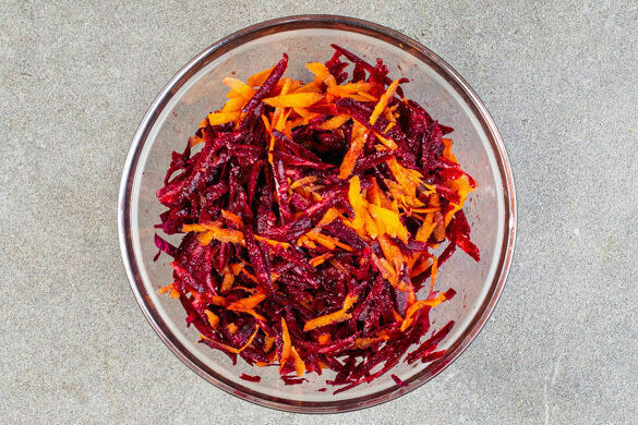 Die Karotten ggf. schälen und grob reiben. Mit 2EL Pflanzenöl, 2–3EL (hellem) Essig und je 2 kräftigen Prisen Zucker, Salz und Pfeffer vermengen, ca. 1Min. gut mit den Händen durchkneten und beiseitestellen.