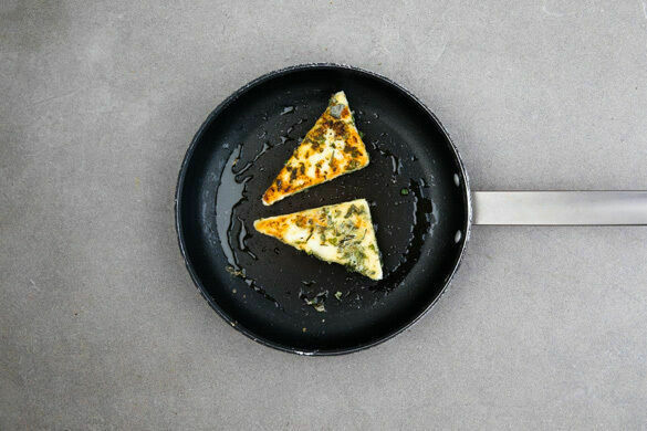 Den Feta in einer zweiten großen Pfanne mit 2EL Olivenöl bei mittlerer Hitze auf jeder Seite 2–3Min. goldbraun anbraten.