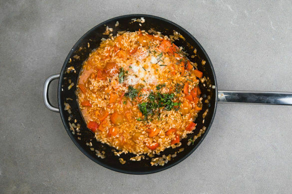 Die Tomaten samt Flüssigkeit unterrühren, dann die restliche Brühe nach und nach angießen und den Reis 18–20Min. sanft köcheln lassen, bis die gesamte Flüssigkeit aufgesogen und der Reis cremig und gar ist. Etwa nach der Hälfte der Zeit die Paprika unterrühren und mitgaren.