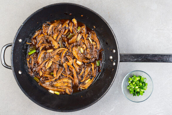 Die Bohnensauce, das Brühgewürz, 150–200ml Wasser sowie 1EL Zucker zu den Pilzen in die Pfanne geben. Bei mittlerer bis starker Hitze 3–4Min. aufkochen, dabei gelegentlich umrühren. Den grünen Teil der Lauchzwiebel in grobe Ringe schneiden.