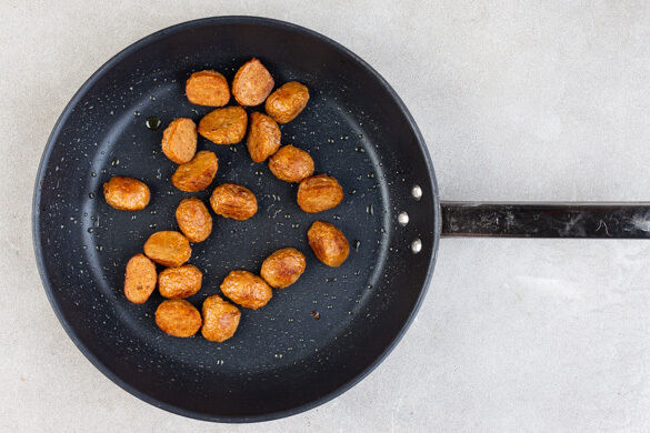Die veganen Hackbällchen halbieren und in einer mittelgroßen Pfanne mit 1EL Olivenöl bei mittlerer Hitze 3–5Min. goldbraun anbraten. Auf einem Teller beiseitestellen.