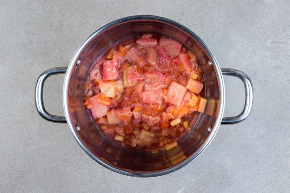 Die Apfel- und Rhabarberstücke in einen mittelgroßen Topf geben, 50g Zucker unterrühren und bei mittlerer Hitze 10–12Min. köcheln lassen, bis die Äpfel weich sind und der Rhabarber zerfällt. Ggf. etwas Wasser hinzufügen, damit der Rhabarber nicht anbrennt.