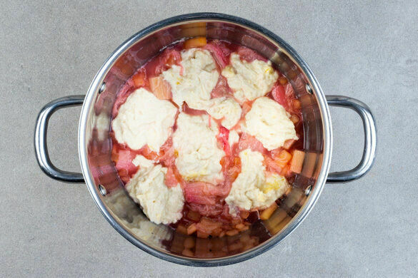 Den Teig löffelweise auf dem Kompott verteilen. Den Topf mit einem eng abschließenden Deckel abdecken und die Teighaube ca. 14Min. garen, dabei auf keinen Fall den Deckel anheben!