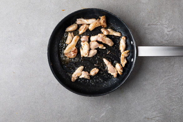Das Fleisch in einer großen Pfanne mit 1–2TL Olivenöl bei mittlerer Hitze 5–6Min. goldbraun anbraten. Das Fleisch aus der Pfanne nehmen und auf einem Teller beiseitestellen.