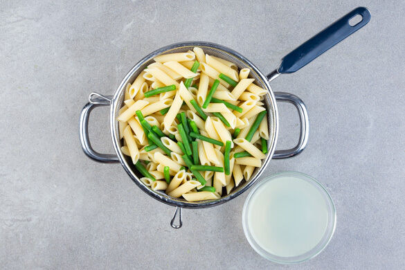 Die Pasta und die Bohnen ins kochende Wasser geben und 7–9Min. kochen, bis die Pasta und die Bohnen bissfest sind. Ca. 1 Tasse Kochwasser abschöpfen, dann die Pasta und die Bohnen in ein Sieb abgießen und abtropfen lassen.