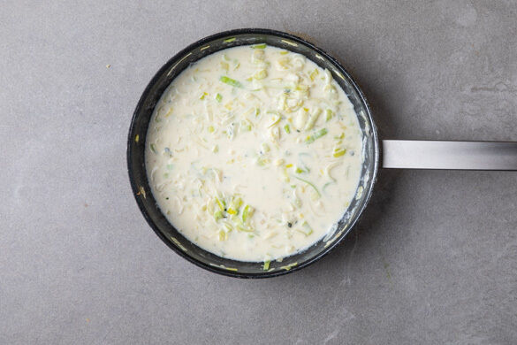 Den Lauch, den Knoblauch und den Thymian in der Pfanne mit 1–2TL Olivenöl, 1/2TL Zucker und 1 Prise Salz bei mittlerer Hitze ca. 3Min. braten, bis der Lauch weich wird. Mit 100ml Wasser ablöschen, das Brühgewürz einstreuen und die Crème fraîche unterrühren. Die Sauce abgedeckt ca. 5Min. köcheln lassen, ggf. etwas mehr Wasser zugeben.