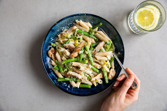 Die abgetropfte Pasta-Bohnen-Mischung und das Fleisch in der Pfanne mit der Sauce vermengen und alles noch 1–2Min. köcheln lassen. Den Käse fein reiben und die 1/2 des Käses unter die Pasta rühren, ggf. mit etwas Kochwasser verdünnen und erneut mit Salz und Pfeffer abschmecken. Die Pasta Alfredo mit dem restlichen Käse bestreut servieren.