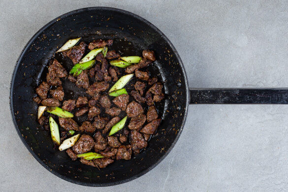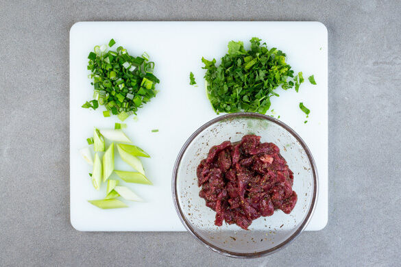 Das Fleisch trocken tupfen und mit der Gewürzmischung und 1EL Pflanzenöl vermengen. Den Koriander samt Stängeln grob schneiden. Den weißen Teil der Lauchzwiebel schräg in 2–3cm lange Stücke, den grünen Teil in Ringe schneiden.