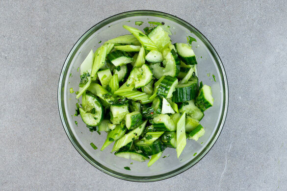 Die Gurke auf ein Brett legen und mit der flachen Klinge eines breiten Messers oder einem Nudelholz so lange schlagen, bis die Gurke auf- bzw. in Stücke bricht. Dann grob in mundgerechte Stücke schneiden. Den Sellerie schräg in ca. 1cm dicke Scheiben schneiden. Die Gurke und den Sellerie mit dem Dressing vermengen.