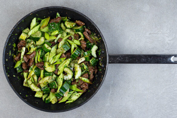 Wer Thai-Küche mag, wird dieses Rezept lieben! Der heimliche Star im Ensemble ist ein aromatischer Gurkensalat: Durch sanfte Schläge mit dem Nudelholz wird die Gurke aufgebrochen und kann das süß-sauer-scharfe Dressing besonders gut aufnehmen, Sellerie sorgt für extra Würze – zusammen mit pikant gebratenem Rindfleisch und nussigen Kokosflocken eine Kombi, die alle Geschmacksknospen aufblühen lässt. Khõ hai dja, guten Appetit!