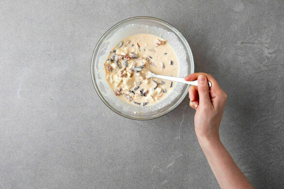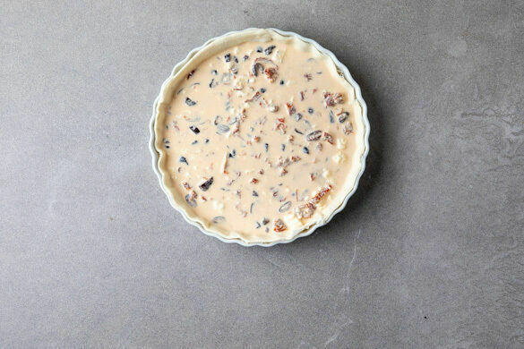 Die Form mit dem fertig vorgebackenen Teig aus dem Ofen nehmen und das Backpapier samt Backgewicht entfernen. Die Füllung eingießen und glatt streichen. Die Quiche auf der mittleren Schiene 20–30Min. backen, bis die Füllung gestockt und an der Oberfläche goldbraun ist. Im Anschluss ca. 5Min. abkühlen lassen, damit die Füllung etwas aushärtet.